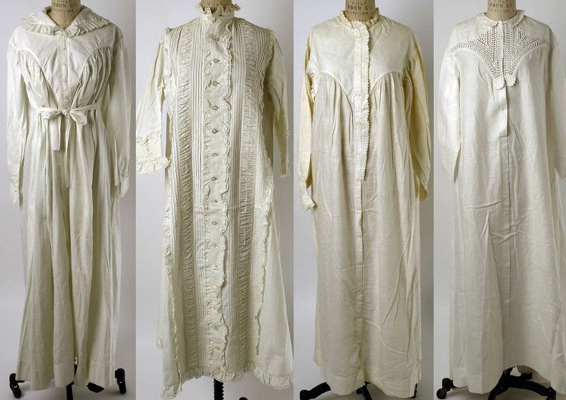 Nightgowns: Women's nightgowns were typically longer and more fitted compared to men's nightshirts. They often featured lace or decorative trims and were sometimes adorned with embroidery or other embellishments. Women's nightgowns also had long sleeves and high necklines, reflecting the modesty and social expectations of the time.