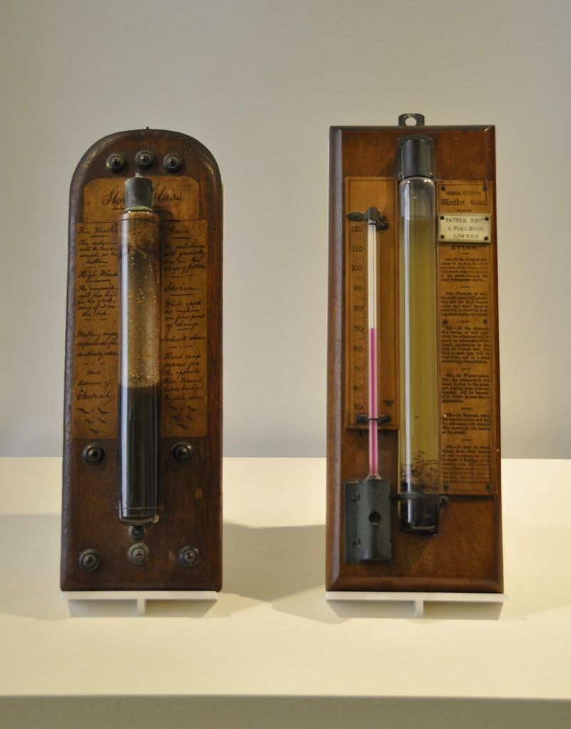 The Fitzroy storm glass, invented in the 19th century by Admiral Robert FitzRoy, is a weather forecasting device. It consists of a sealed glass container filled with a mixture of chemicals that react to changes in atmospheric pressure, temperature, and humidity. The idea behind it is that these chemical reactions will create different crystal formations within the glass, which can be interpreted to predict the weather.